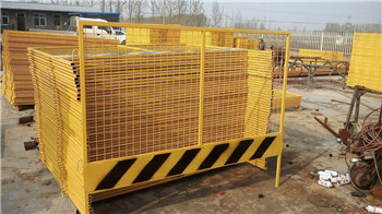 臨邊防護欄常用的是網片型防護欄,由邊框豎管與網片焊接而成,尺寸為1.2*2m,焊接完成后進行噴塑處理。表面上色為紅白或者黑黃相間的顏色,并懸掛安全警示牌以起到警示作用。在臨邊護欄的下部需要設置15-20公分的擋腳板,擋腳板噴涂條形狀黑黃或紅白色條格。